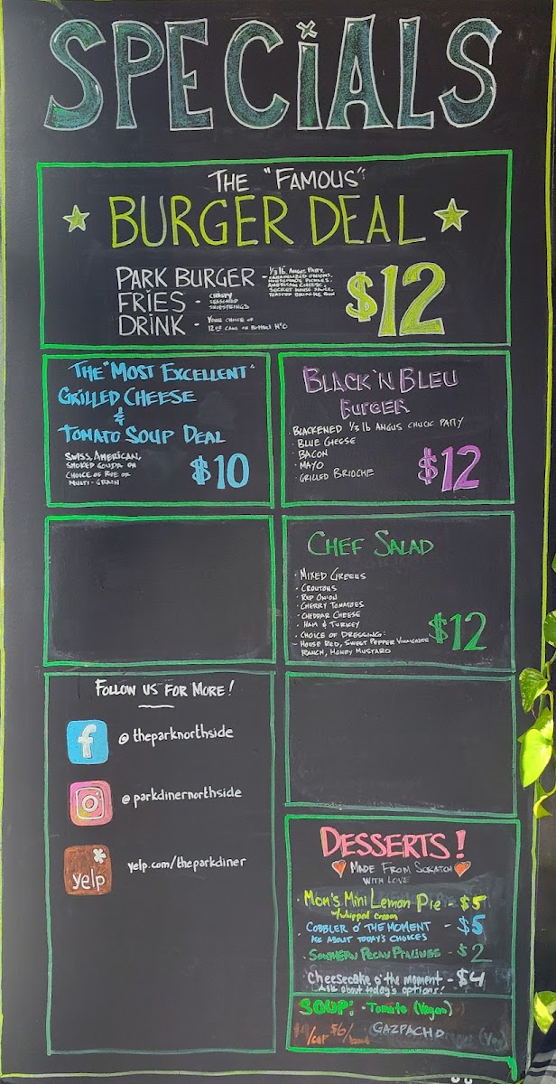 This deal comes with a Park Burger (1/4lb Angus Chuck Smashburger with American cheese, caramelized onions, house-made pickles and our "secret" sauce on a grilled brioche bun), half an order of our crispy, seasoned shoestring fries, and a can of soda.